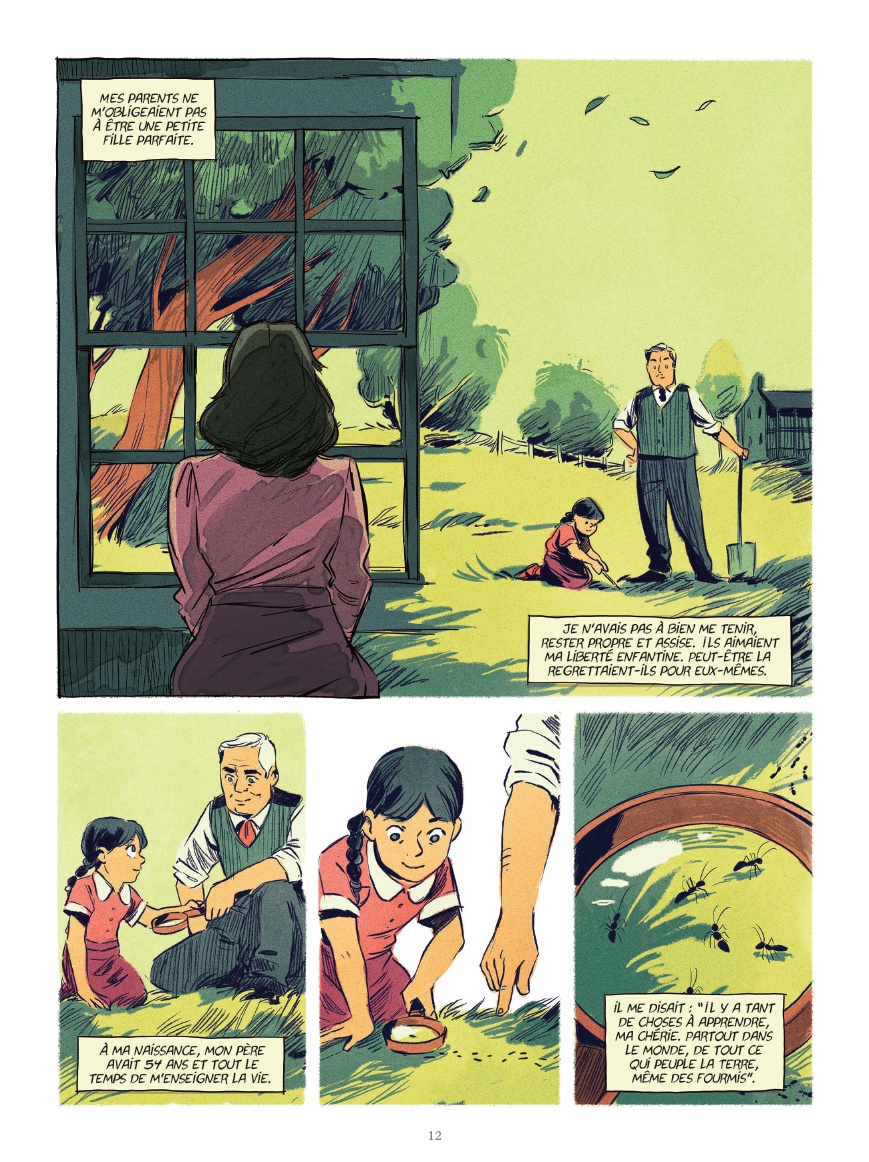 Au niveau du dessin, nous sommes sur des tons jaunâtres, marron qui donnent un sentiment de maladie. Je ne saurais pas l'expliquer facilement, j'ai ressenti une sorte de lourdeur, de torpeur à travers les dessins. C'était un sentiment d’oppression. Les moments où Nellie nous parle de son enfance en pleine campagne, sont plus colorés. On prend une vraie bouffée d'air à travers ses pages.